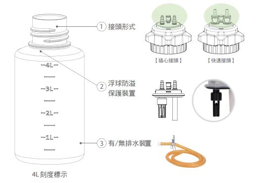 特色: ◆ 大容量 ◆ 便利插心接頭 ◆ 預(yù)防泵進(jìn)水的防溢保護(hù)裝置 ◆ 便利排水裝置 |